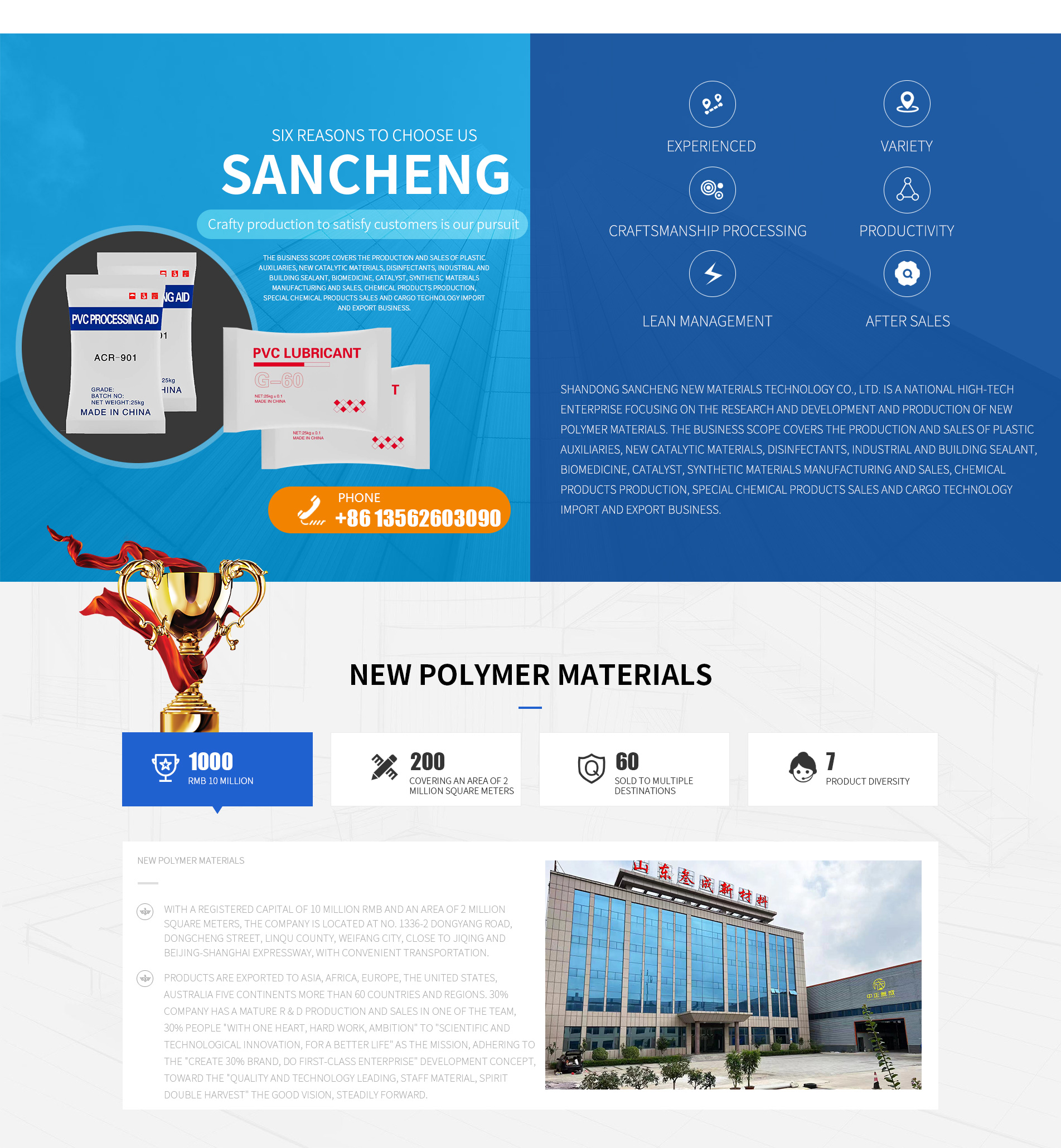 Shandong Sancheng New Materials Technology Co., Ltd. is a national high-tech enterprise focusing on the research and development and production of new polymer materials. The business scope covers the production and sales of plastic auxiliaries, new catalytic materials, disinfectants, industrial and building sealant, biomedicine, catalyst, synthetic materials manufacturing and sales, chemical products production, special chemical products sales and cargo technology import and export business.